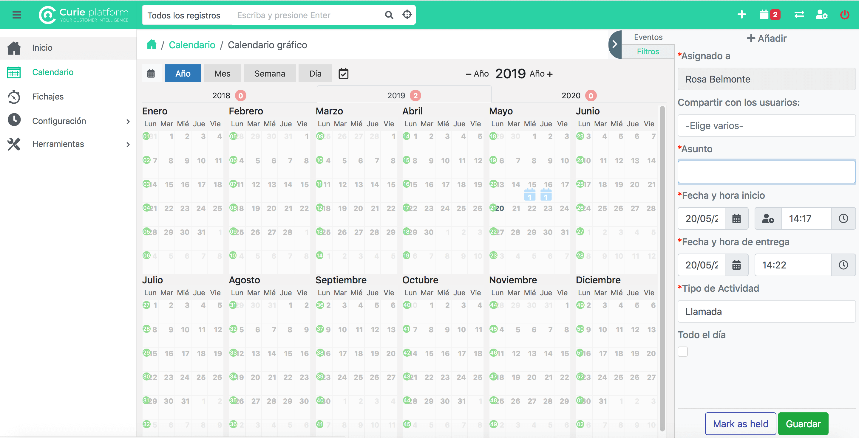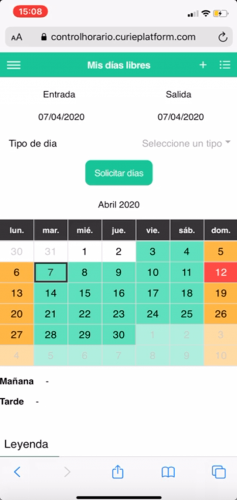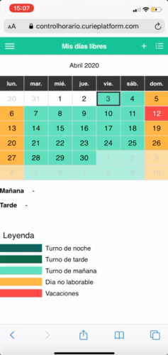 En el calendario podrás ver los días de vacaciones (aprobadas o no), de asuntos propios, días de fiesta y tus turnos en los días laborables, todo esto señalado por colores con su leyenda.