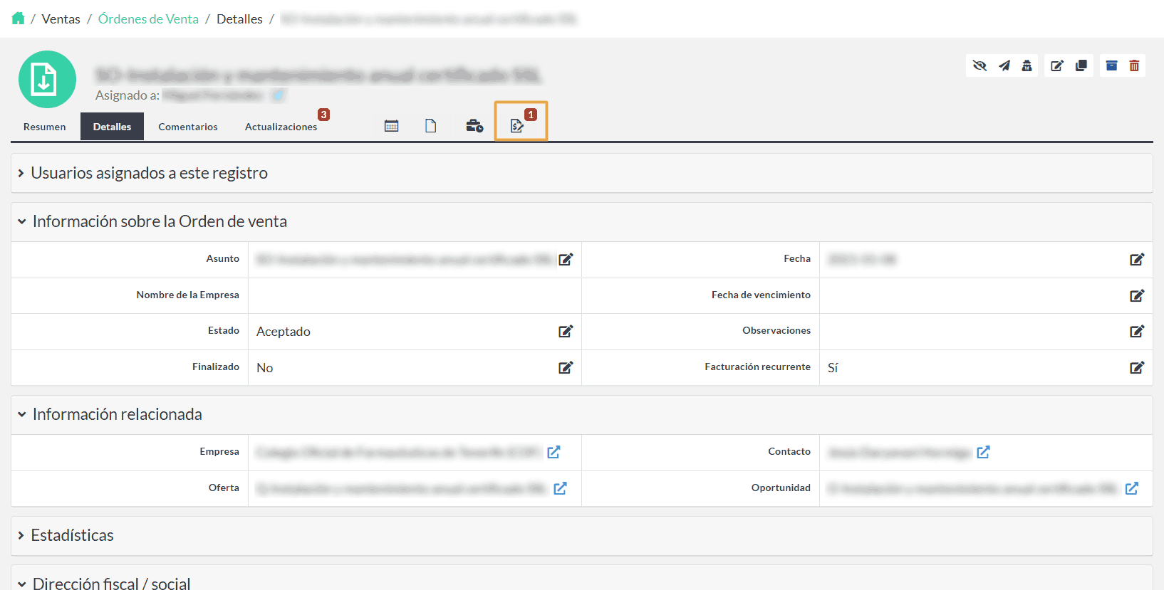 Una vez que se aprueba la oferta, podemos crear un registro de orden de venta a partir de él. Automáticamente, la información en el registro de oferta se transfiere al registro de orden de venta.
