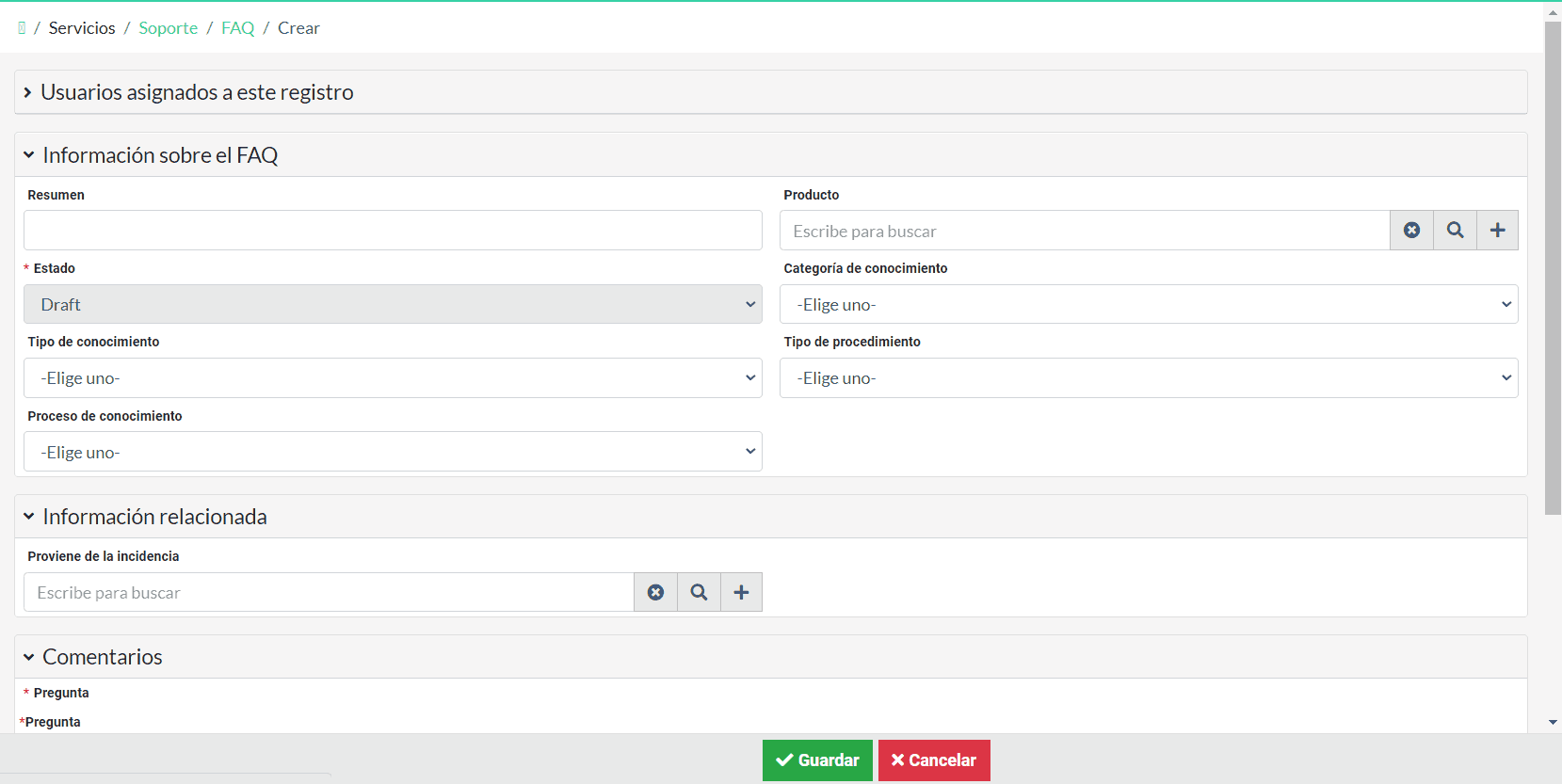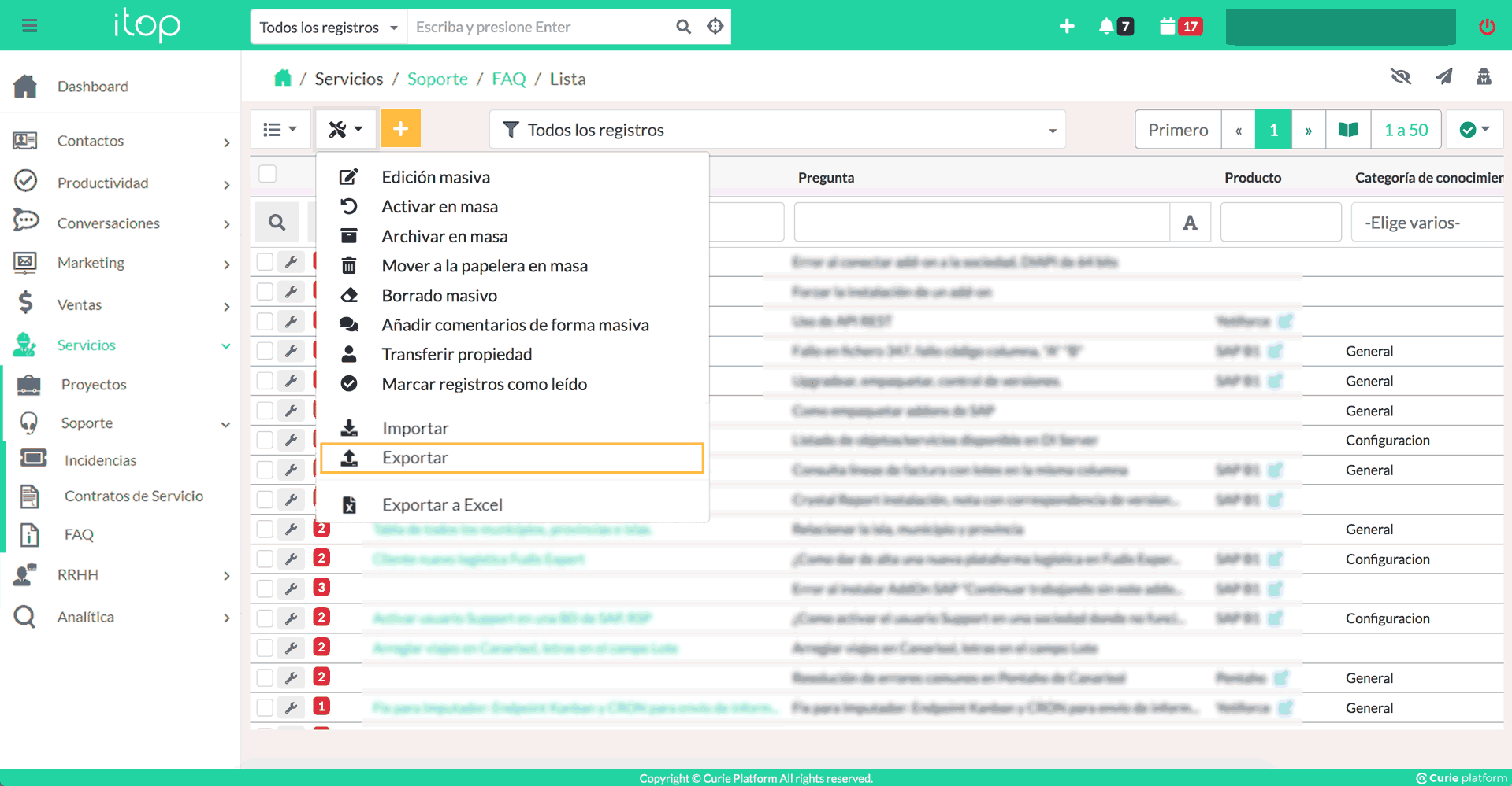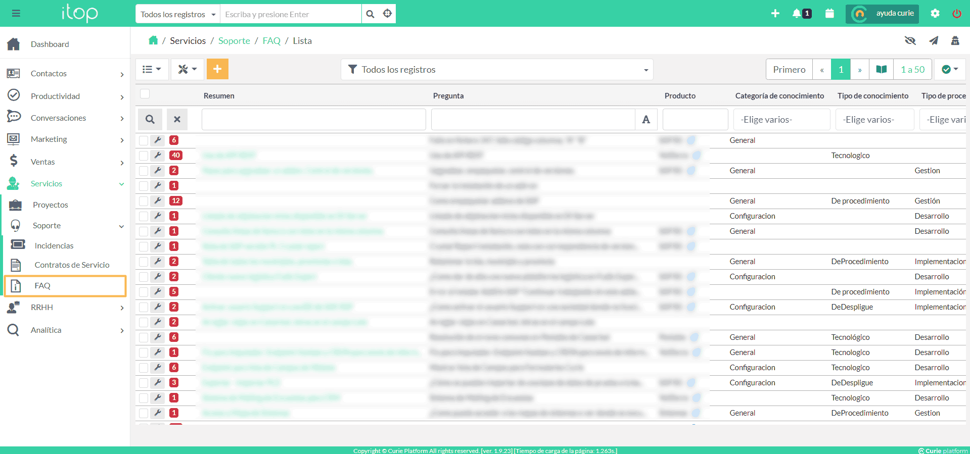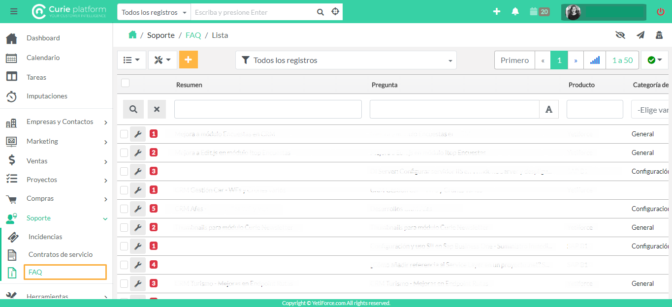 Uno de los módulos incluidos en el proceso “Servicios” de Curie Platform, concretamente en el módulo “Soporte”, es el de “FAQ”.